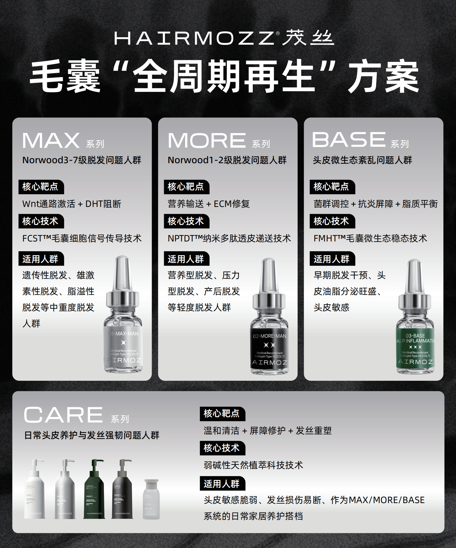 基于科学循证与实际观察,HAIRMOZZ 茂丝可为中重度雄激素性脱发、发际线后退、头顶稀疏及传统方式效果不佳人群,提供一套可落地、可重复、可持续的毛囊健康管理方案。