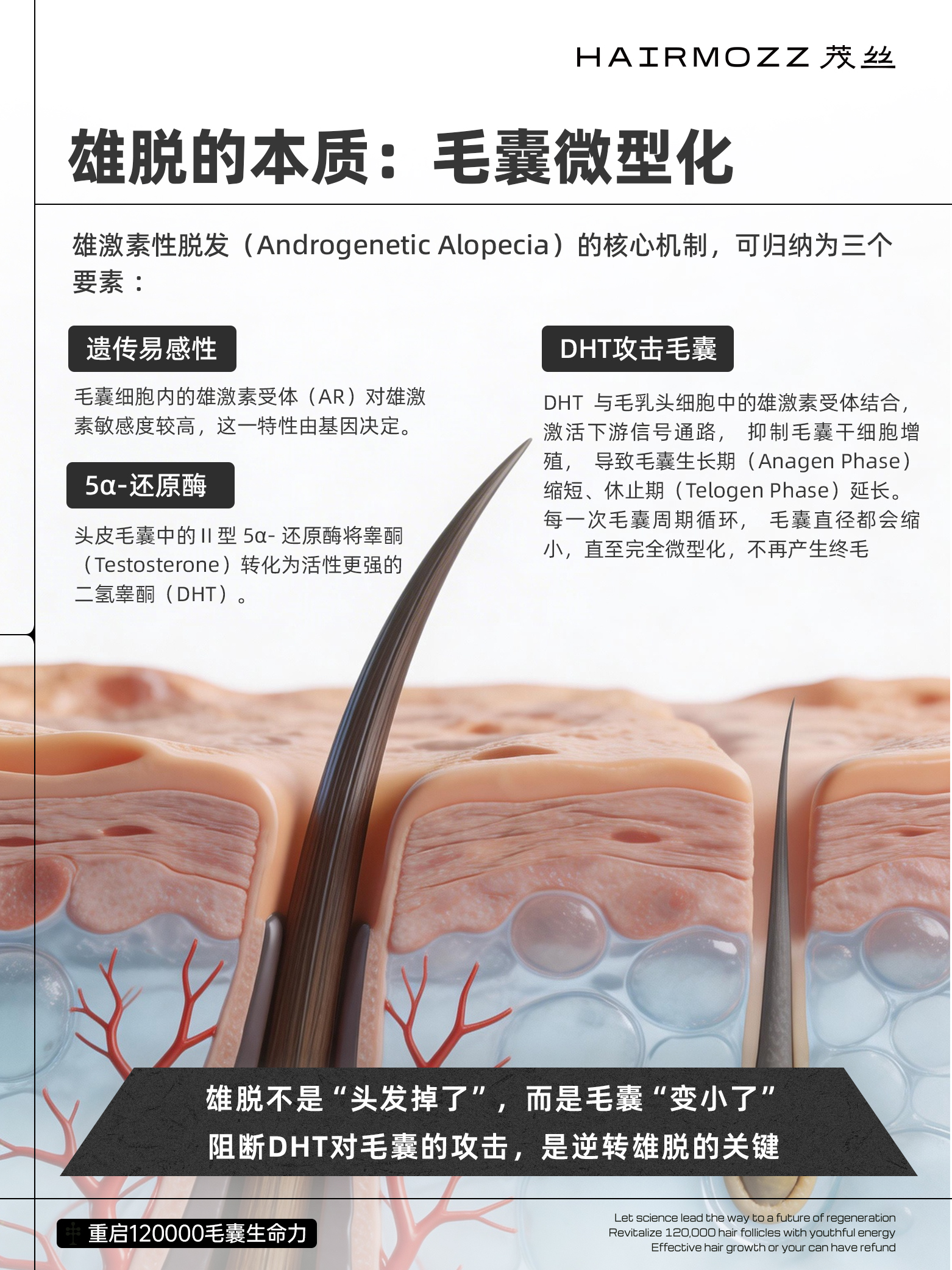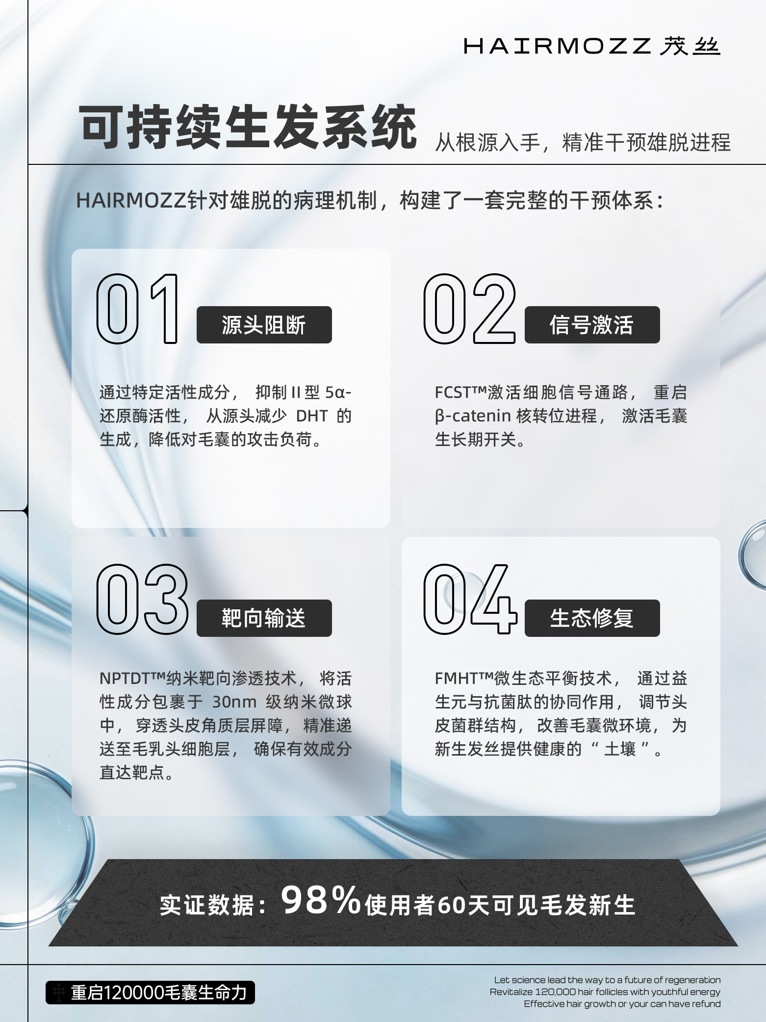 HAIRMOZZ 茂丝立足国际前沿毛囊生物学研究,针对雄激素性脱发的核心机制,构建 “源头调控 — 信号激活 — 靶向递送 — 生态修复” 四维科学体系,以结构性生态位修复 + 受控信号再激活为核心逻辑,实现从根源阻断到毛囊再生的全链条干预。