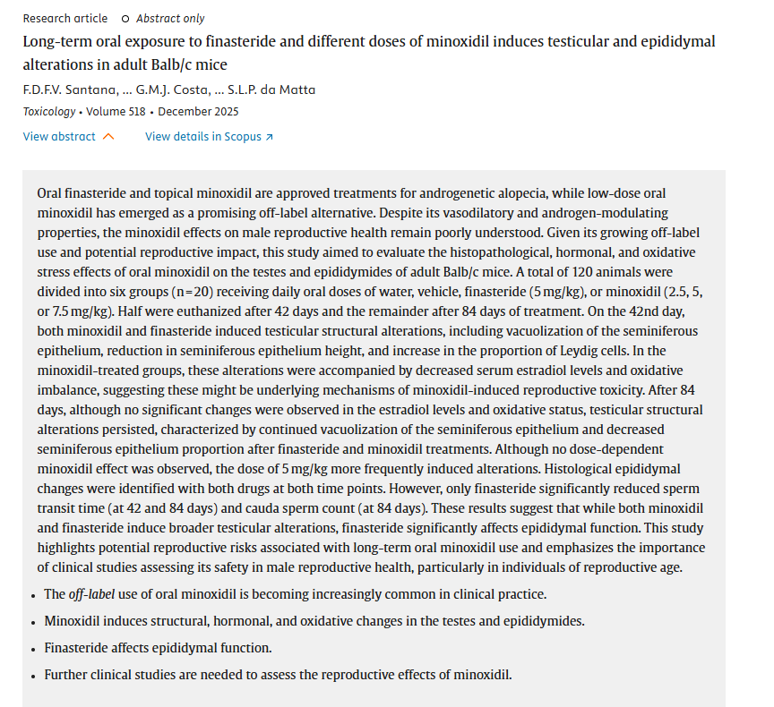 Santana FFV, Ferreira J, Araujo DC, et al. Long-term oral exposure to finasteride and different doses of minoxidil induces testicular and epididymal alterations in adult Balb/c mice. Toxicology. 2025;518:154278. doi:10.1016/j.tox.2025.154278