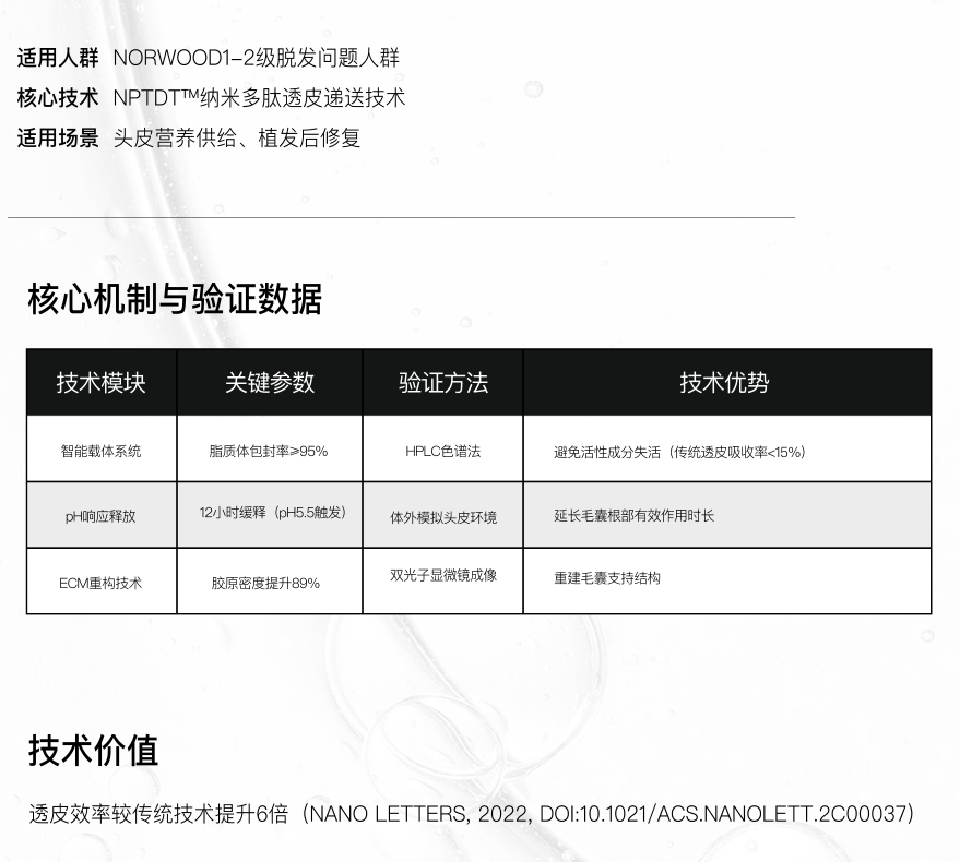 这是HAIRMOZZ技术体系中的关键一环。NPTDT™采用纳米级载体包裹活性成分,实现对毛囊单位的精准递送。靶向作用于局部毛囊层,活性成分主要局限在头皮靶组织内,全身吸收极低,从设计上规避了对内分泌系统的干扰风险。