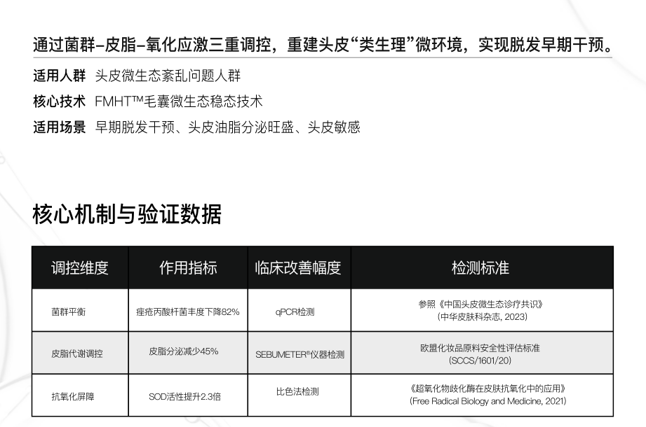 头皮微生态失衡——马拉色菌过度增殖、皮脂成分改变、轻度炎症反应——是雄激素性脱发的重要环境诱因。FMHT™通过调节头皮微生物群落结构,恢复角质层屏障功能,为毛囊创造健康的“土壤”条件。
