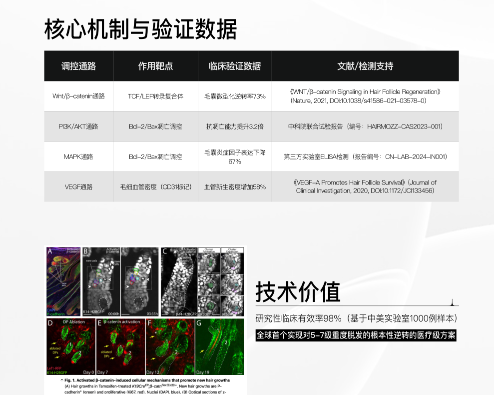 通过精准调控毛囊干细胞中的Wnt/β-catenin、BMP及Shh等信号通路的平衡,HAIRMOZZ帮助将休止期毛囊重新“唤醒”,引导其有序进入生长期,从而在源头上改善毛发生长节律。