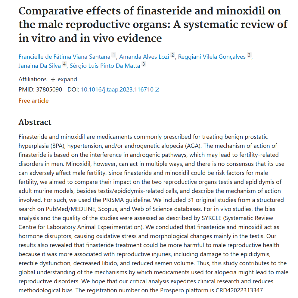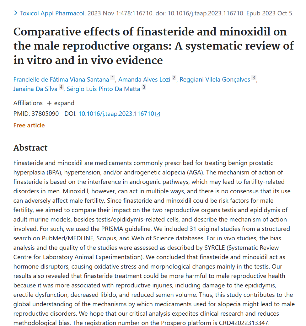 Santana FFV, Lozi AA, Gonçalves RV, Da Silva J, Da Matta SLP. Comparative effects of finasteride and minoxidil on the male reproductive organs: A systematic review of in vitro and in vivo evidence. Toxicology and Applied Pharmacology. 2023;478:116710. doi:10.1016/j.taap.2023.116710