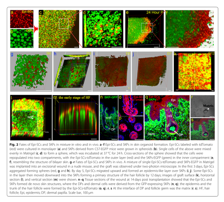 将 1×10⁶ Epi-SCs 与 2×10⁶ SKPs 混合于 Matrigel 中体外培养,通过共聚焦显微镜观察发现:两种细胞在 36 小时内自发迁移、重组,形成 “表皮样外层(Epi-SCs)+ 真皮样内层(SKPs)” 的双层结构,模拟了皮肤的基本组织架构