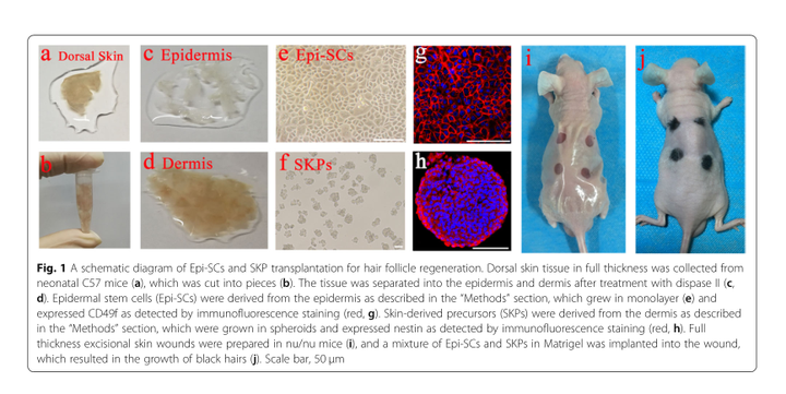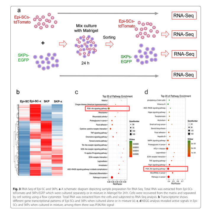 毛囊再生是皮肤组织修复与再生领域的重要课题,其核心在于表皮与真皮细胞的精密协作。近年来,《Stem Cell Research & Therapy》发表的一项研究(Chen et al., 2020)首次明确证实,PI3K/Akt 信号通路是表皮干细胞(Epi-SCs)与皮肤来源前体细胞(SKPs)协同介导新生毛囊(de novo hair follicle)形成的必需机制,为理解毛囊再生的分子调控网络提供了关键线索。