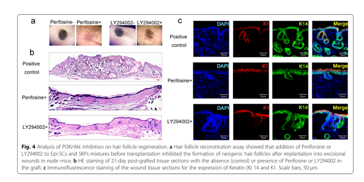 向细胞混合物中分别加入 PI3K 特异性抑制剂 LY294002(500μM)或 Akt 特异性抑制剂 Perifosine(2mM),移植后 21 天的组织学分析显示:新生毛囊完全消失,但表皮分层(角蛋白 14/1 表达正常)不受影响,证实 PI3K/Akt 通路是毛囊新生的必需条件,且功能具有特异性。