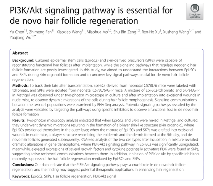 Chen Y, Fan Z, Wang X, et al. PI3K/Akt signaling pathway is essential for de novo hair follicle regeneration[J]. Stem Cell Research & Therapy,2020,11:144.DOI: 10.1186/s13287-020-01650-6.