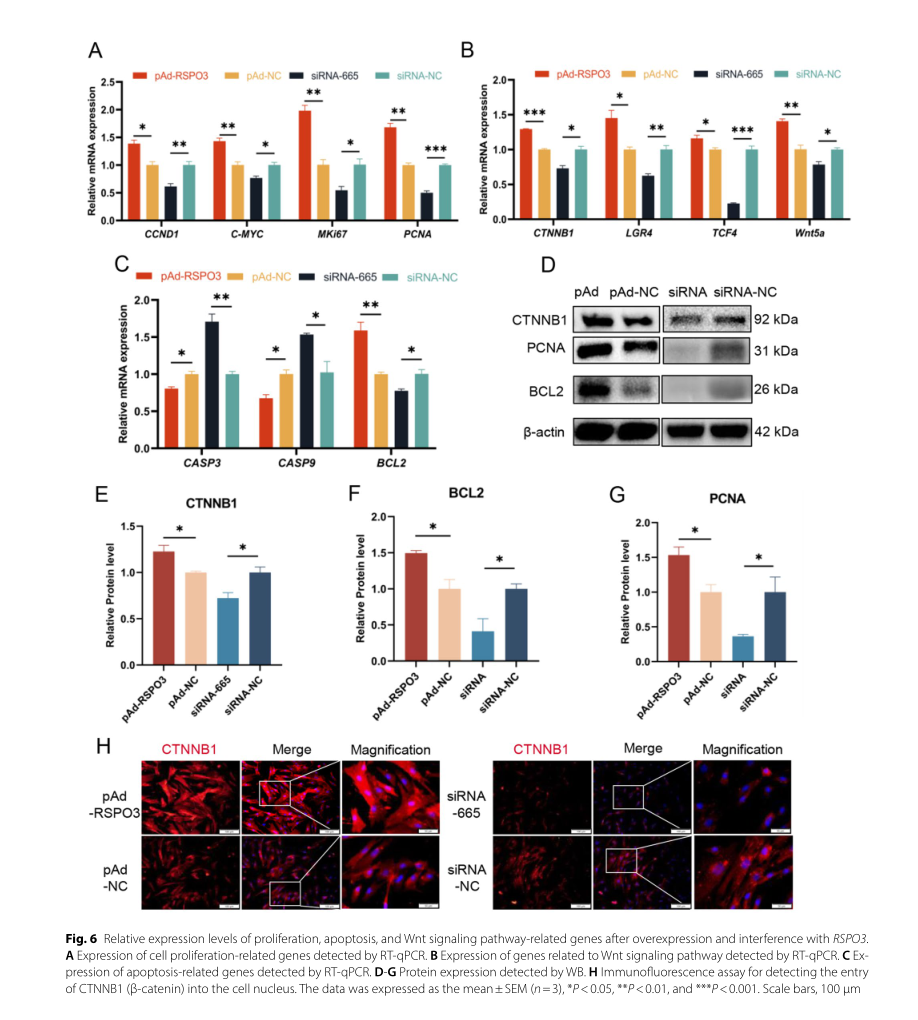 ·增殖层面:过表达 RSPO3 使 DPCs 增殖相关基因(CCND1、PCNA、MKI67)mRNA 表达上调 1.2-1.8 倍,PCNA 蛋白表达提升 50%;干扰 RSPO3 则完全相反;