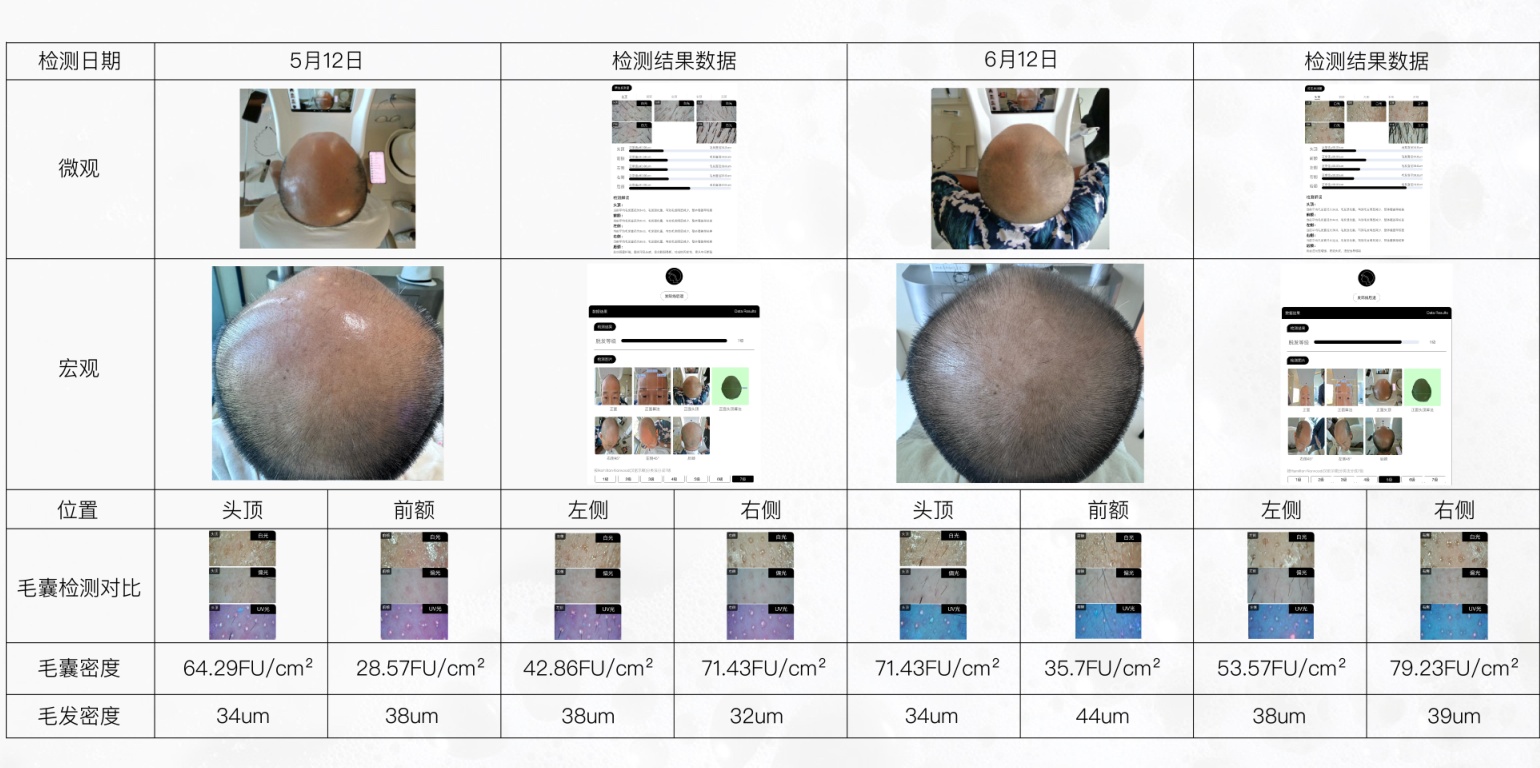 效果表现:6 个月内,受试者毛发密度平均提升 85%,新生毛发中 “粗硬健康毛发” 占比从 20% 升至 65%;