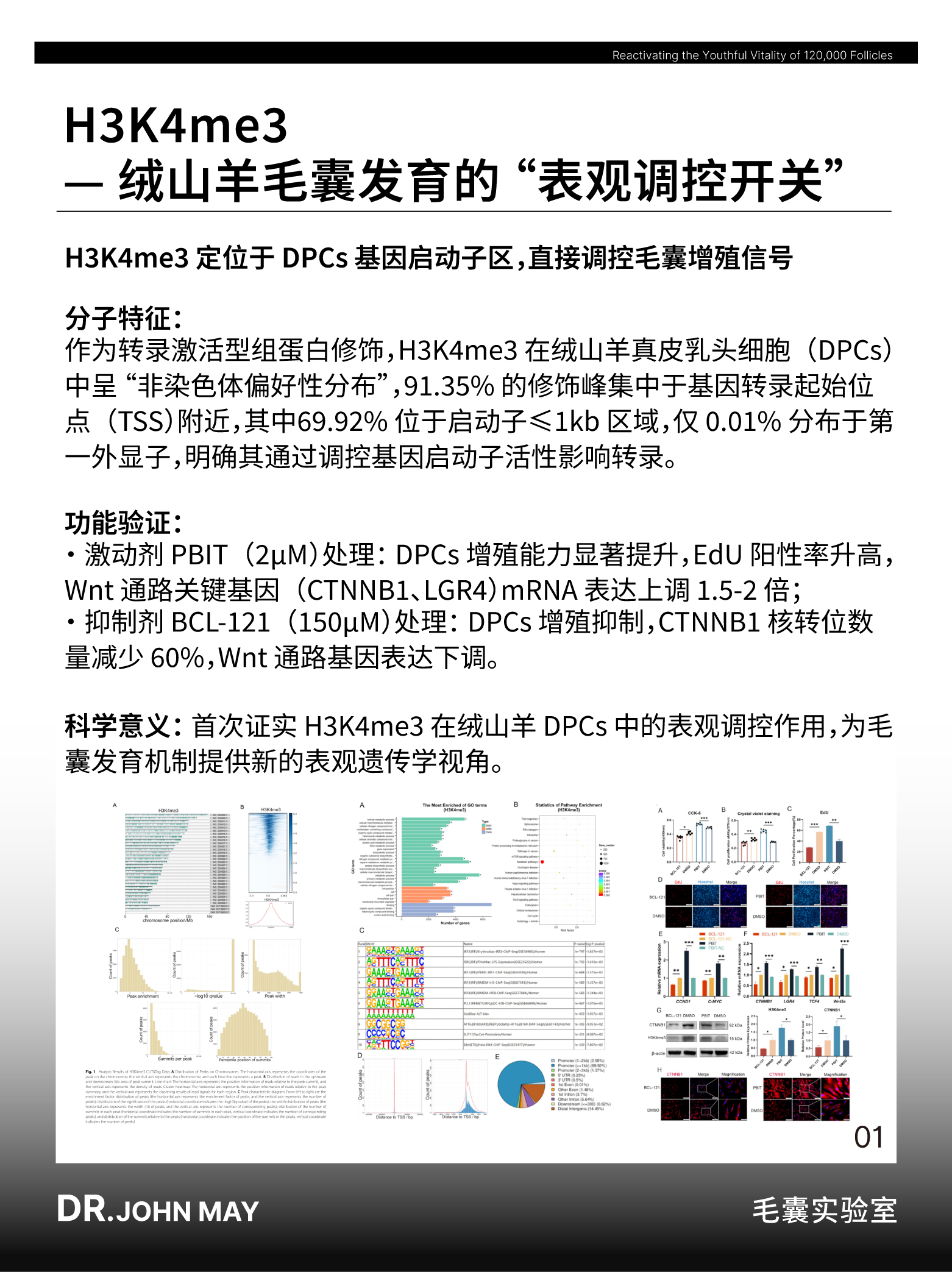 这项以绒山羊为模型的研究,首次完整解析了 “组蛋白修饰 H3K4me3→靶基因 RSPO3→Wnt/β-catenin 信号通路” 的三级调控轴,不仅填补了毛囊表观遗传领域的空白,更成为我方毛囊信号通路制剂实现 98% 生发率的核心科学依据。今天,我们就从基础研究到临床转化,拆解这篇文献如何为脱发治疗提供 “从机制到方案” 的完整答案。