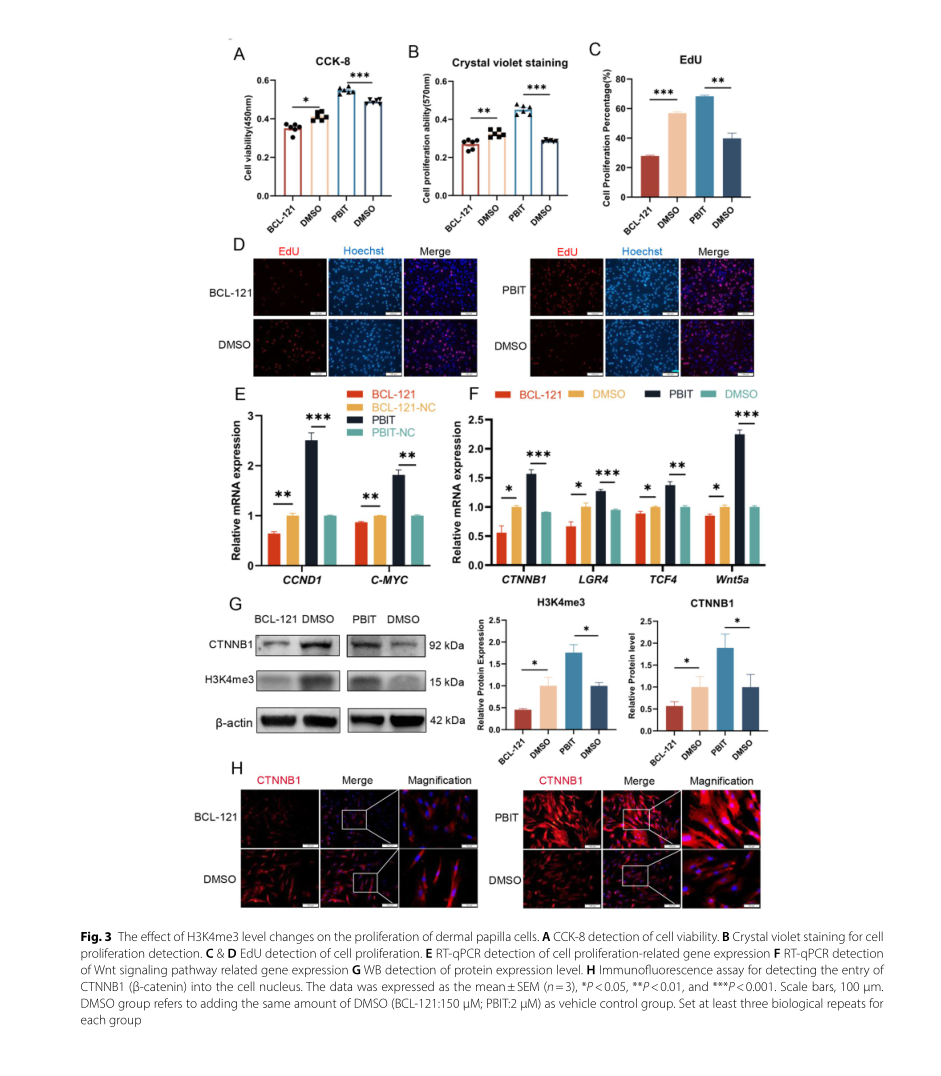 本研究中,H3K4me3 的调控是 “靶向性” 的(仅作用于毛囊相关基因),而非 “广谱调控”。我方制剂采用的是 “局部外用 + 纳米载体递送” 技术,成分仅作用于头皮 DPCs,不进入血液循环,避免了对全身基因表达的影响,长期使用安全性可控。