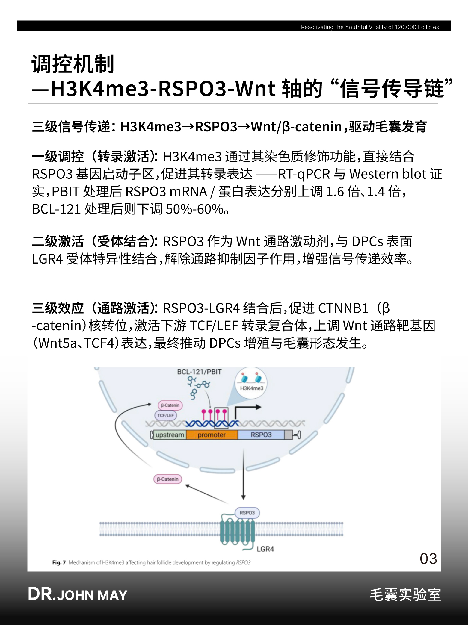 至此,“H3K4me3→RSPO3→Wnt/β-catenin” 的完整调控轴被证实 —— 这就是毛囊发育的 “核心分子逻辑”。