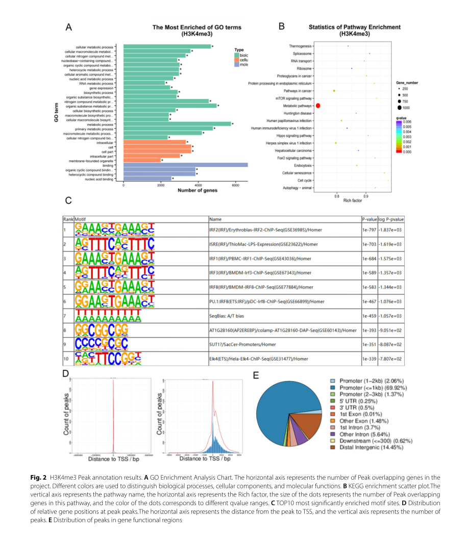 ·其中69.92% 的修饰峰直接定位于基因启动子≤1kb 区域,仅 0.01% 分布在第一外显子(图 2E)。