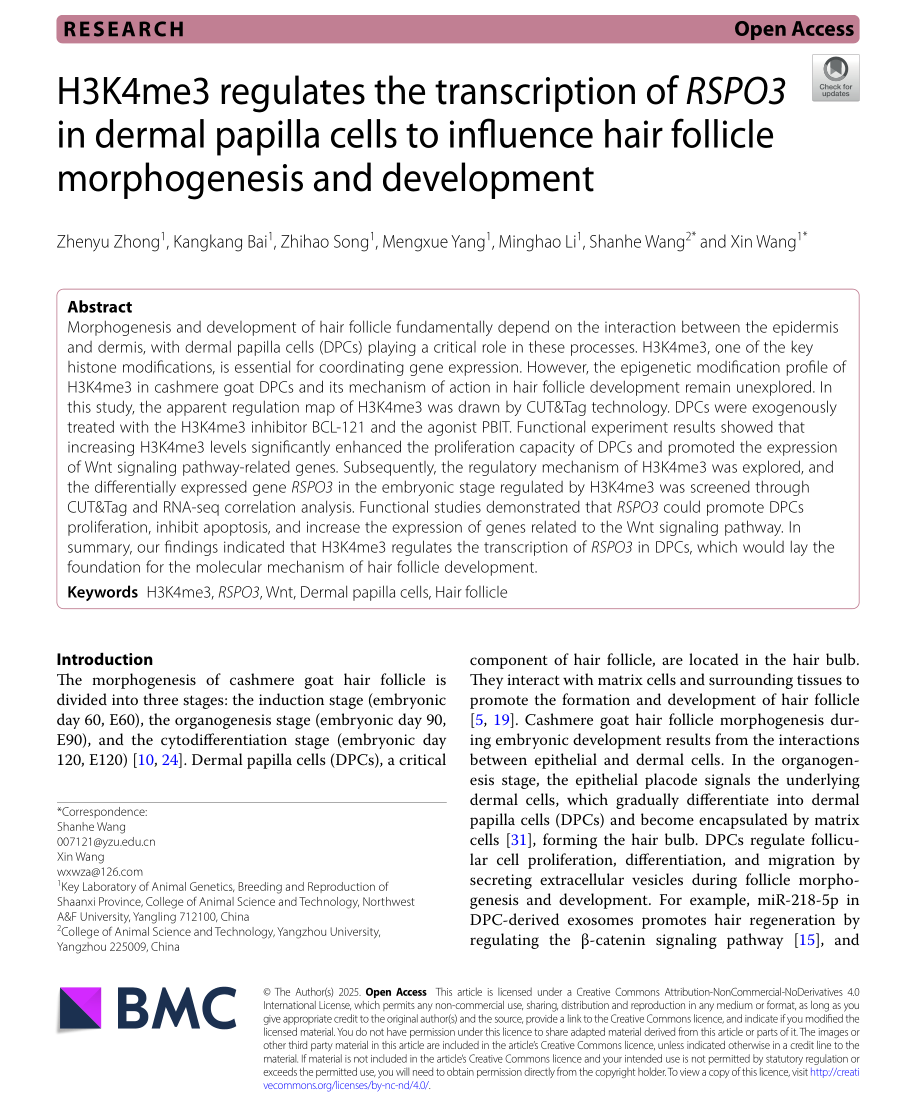 Zhong Z, Bai K, Song Z, et al. H3K4me3 regulates the transcription of RSPO3 in dermal papilla cells to influence hair follicle morphogenesis and development[J]. Epigenetics & Chromatin, 2025, 18(1):52.