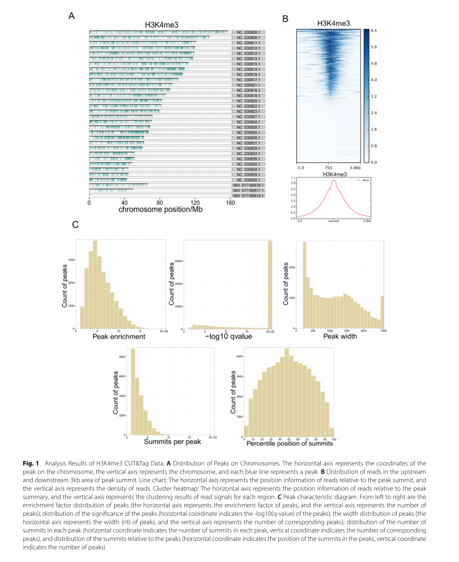 研究者首先通过CUT&Tag 技术(高精度组蛋白修饰定位技术),绘制了绒山羊 DPCs 中 H3K4me3 的全基因组分布图谱 —— 这是理解其功能的第一步。