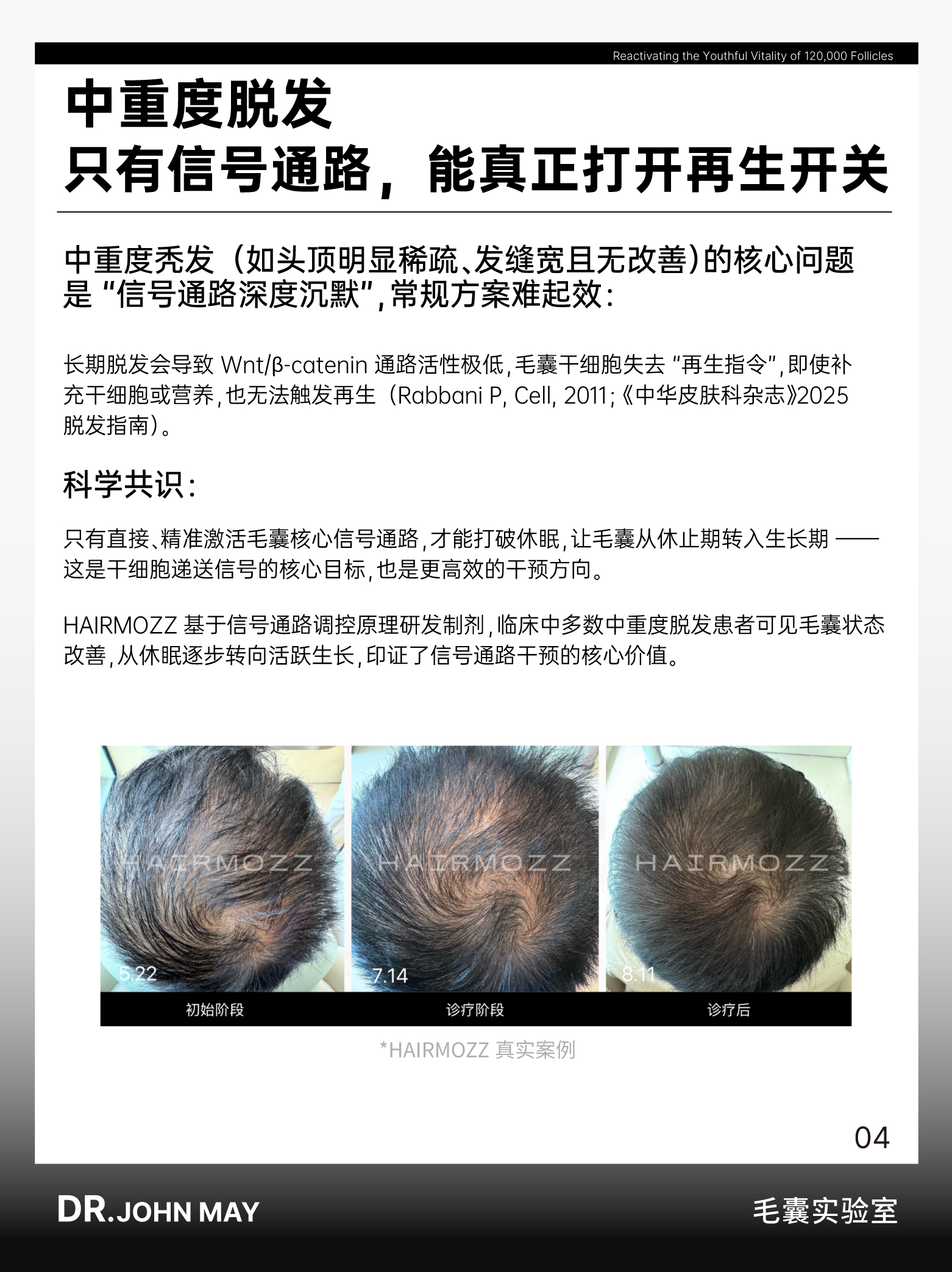 而对于中重度秃发患者,由于长期脱发已导致 Wnt/β-catenin 通路深度沉默,仅靠干细胞间接递送信号,难以打破通路休眠状态,需更直接的信号通路调控方案。《中华皮肤科杂志》2025 年《中国雄激素性脱发诊疗指南》也强调,中重度秃发的干预核心应聚焦 “直接激活毛囊核心信号通路”,而非依赖信号载体的间接作用。