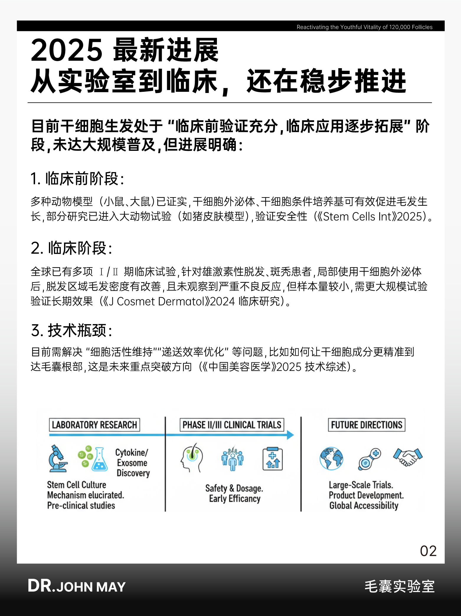 尽管机制明确且被视为行业大趋势,但 2025 年的研究进展表明,干细胞生发目前仍无法实现大规模临床普及,核心瓶颈集中在技术转化阶段。在临床前研究层面,成果已较为成熟: