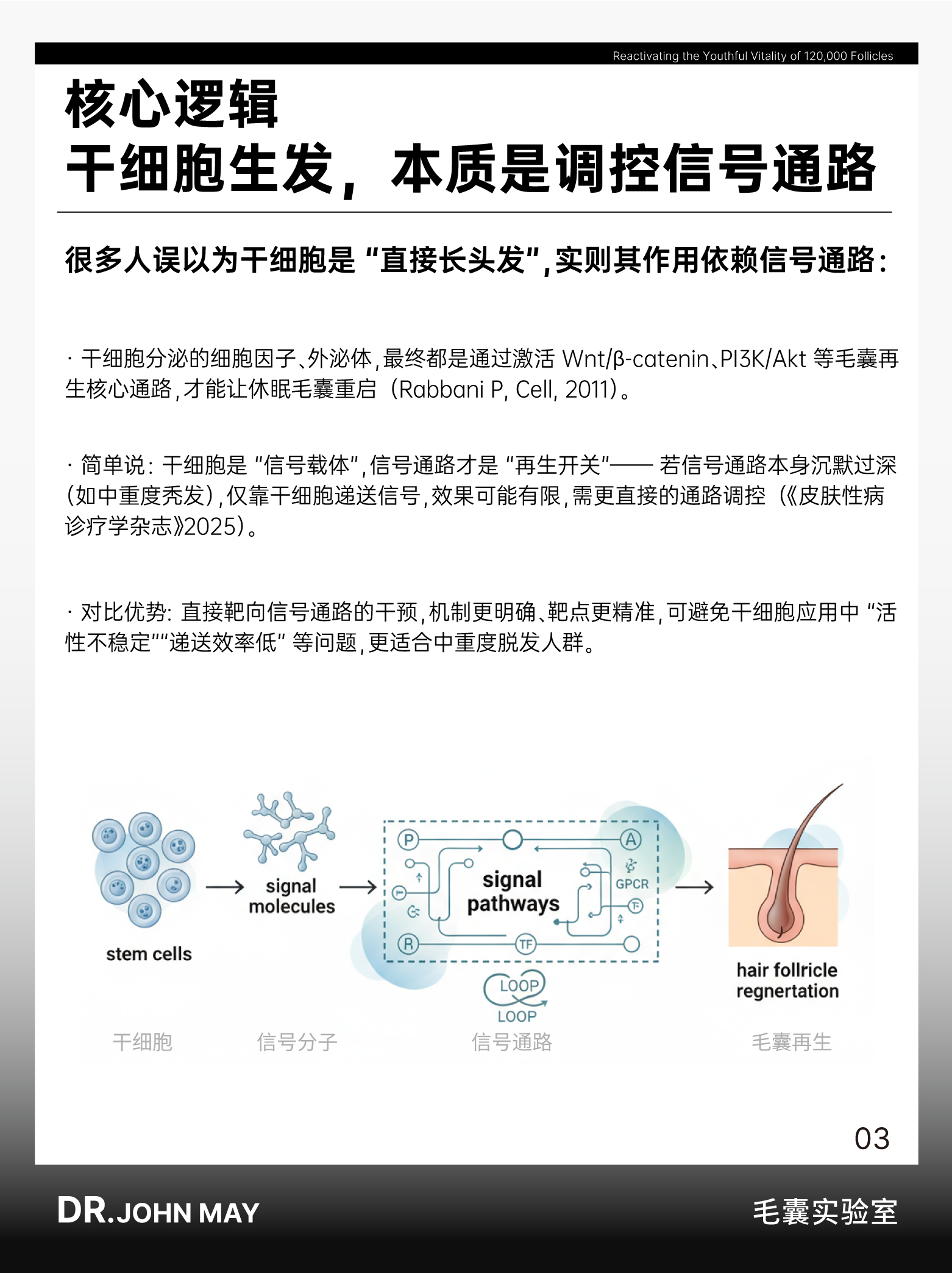 未来,随着信号通路调控技术的进一步优化,以及与干细胞递送技术的潜在结合,脱发干预或将实现 “载体精准 + 通路激活” 的双重突破,但无论技术如何发展,“以科研证据为基础、以核心机制为导向”,始终是确保干预有效性与安全性的核心原则。