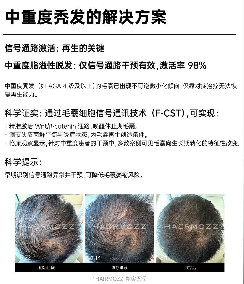 临床研究证实,中重度脱发(如 AGA 4 级及以上)患者的毛囊已出现不可逆的微小化倾向,单纯补充营养或调节激素无法逆转这一进程。2025 年《Cell》最新研究表明,这类毛囊的信号通路处于深度沉默状态,需要通过外源性干预重新激活 Wnt/β-catenin 通路,才能恢复其从休止期向生长期的转化能力。