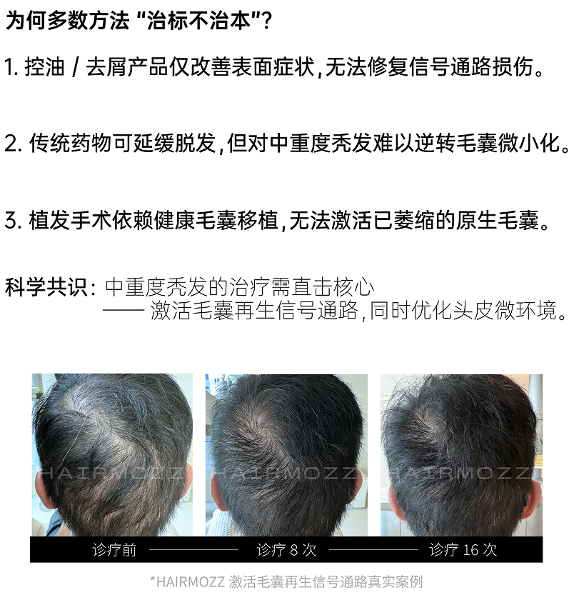传统治疗的局限正在于此:控油洗发水仅能清除表面皮脂,无法触及信号通路;酮康唑等抗真菌成分虽能减少菌群,但不能修复已受损的信号网络;即使是临床常用药物,也因难以穿透毛囊深层而效果有限。正如 2025 年《中国雄激素性脱发诊疗指南》指出,单一对症治疗无法解决毛囊再生的核心矛盾。