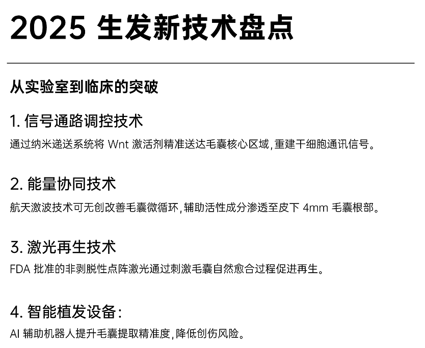 从理解毛囊 "语言" 到重启再生程序,生发科技已进入信号调控的精准时代。当技术突破能够精准靶向毛囊干细胞的信号网络,当干预手段能同时改善细胞通讯与微环境,中重度秃发的逆转不再是奢望。这不仅是科技的胜利,更是对脱发本质认知深化的必然结果。