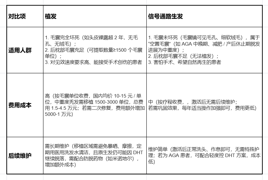 植发和信号通路生发的核心差异,在于 “是否能修复自身毛囊”—— 对中重度秃发而言,若自身毛囊未坏死,信号通路生发是 “更安全、更自然、性价比更高” 的选择,毕竟 “唤醒自己的毛囊,比移植别人的毛囊更贴合需求”;若毛囊已完全坏死,植发或者假发则是更直接的外观改善方案。