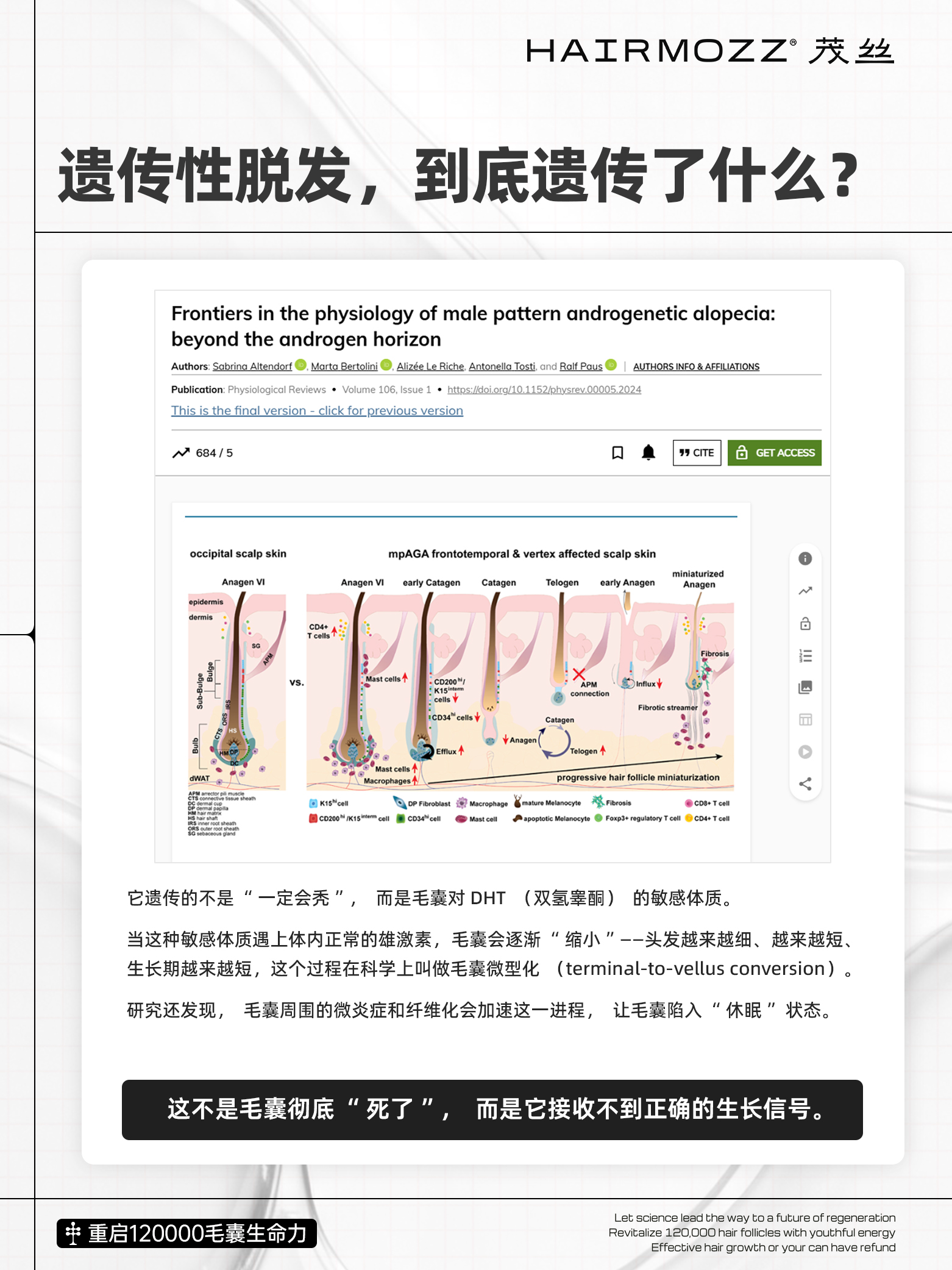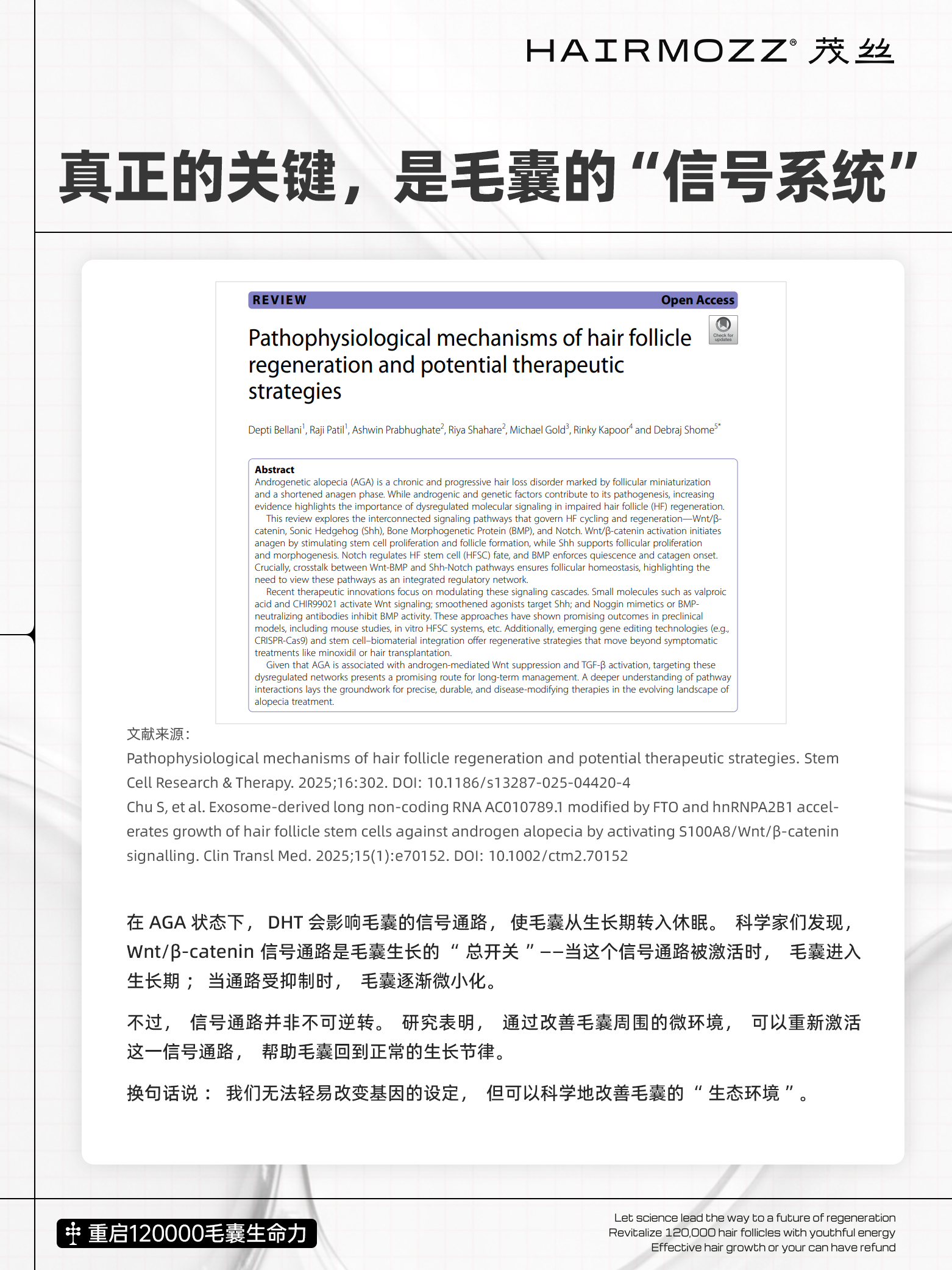 在谈论遗传性脱发(AGA)时,人们常将目光锁定在无法改变的基因上。但前沿的毛囊生物学研究正在揭示一条新路径——通过重建毛囊周围的细胞外基质(ECM)生态位,温和重启Wnt/β-catenin生长信号,让“休眠”的毛囊重新感知生长指令。这正是HAIRMOZZ茂丝的科学出发点。