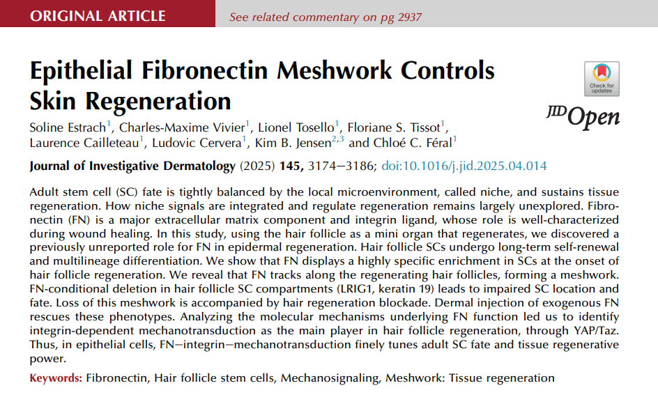 Estrach S, Vivier CM, Tosello L, et al. Epithelial Fibronectin Meshwork Controls Skin Regeneration. Journal of Investigative Dermatology. 2025;145(12):3174-3186.e5.