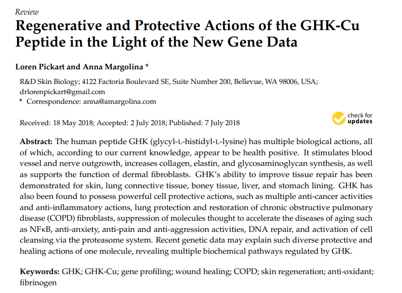 Pickart L, et al. The human tripeptide GHK-Cu in prevention and treatment of aging and cancer: mechanistic insights and clinical applications. Biomolecules. 2021;11(10):1442.